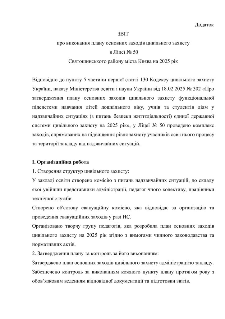 Практичне закріплення теоретичного матеріалу здійснюється шляхом щорічного проведення Дня цивільного захисту.