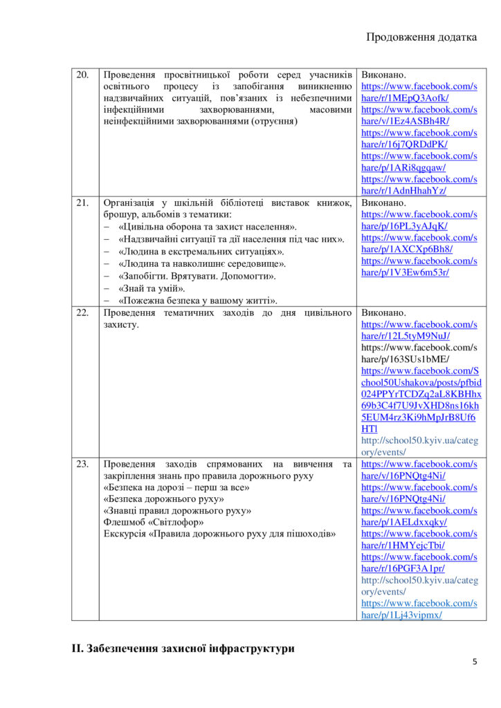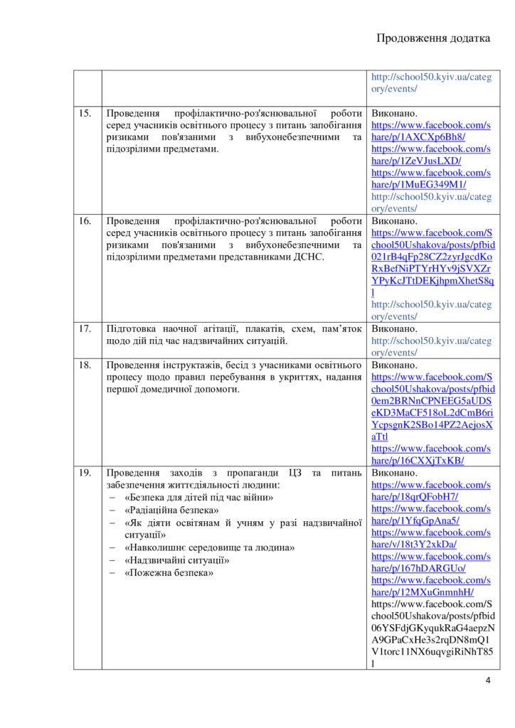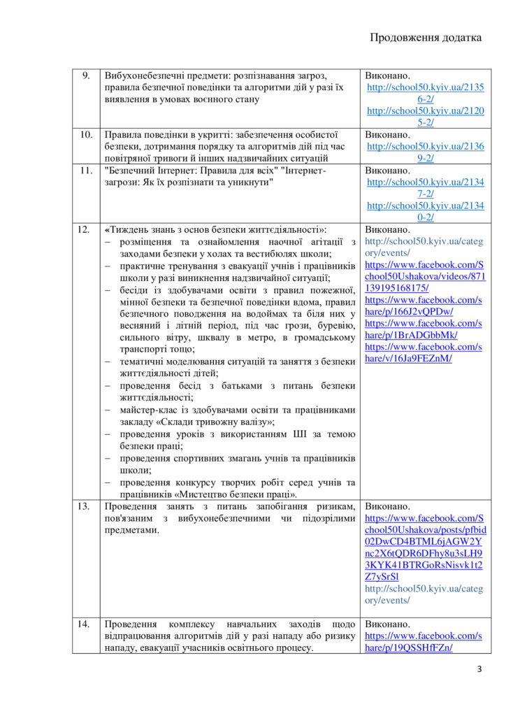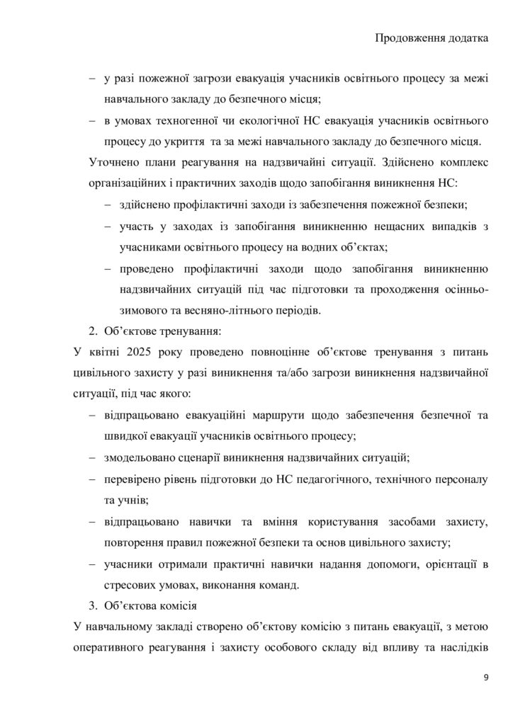 У закладах освіти передбачене тренування щодо евакуації учасників освітнього процесу не рідше одного разу на пів року та проведення Дня цивільного захисту та Тижня знань з основ безпеки життєдіяльності у закладах професійної (професійно-технічної) та загальної середньої освіти й Тижнів безпеки дитини у закладах дошкільної освіти.