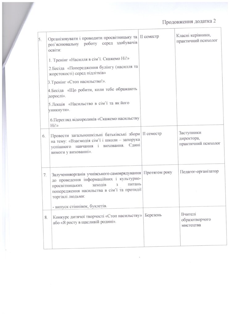 | 4 | Конкурс малюнків «Діти проти насильства» | Листопад — грудень | Пед.-організатор