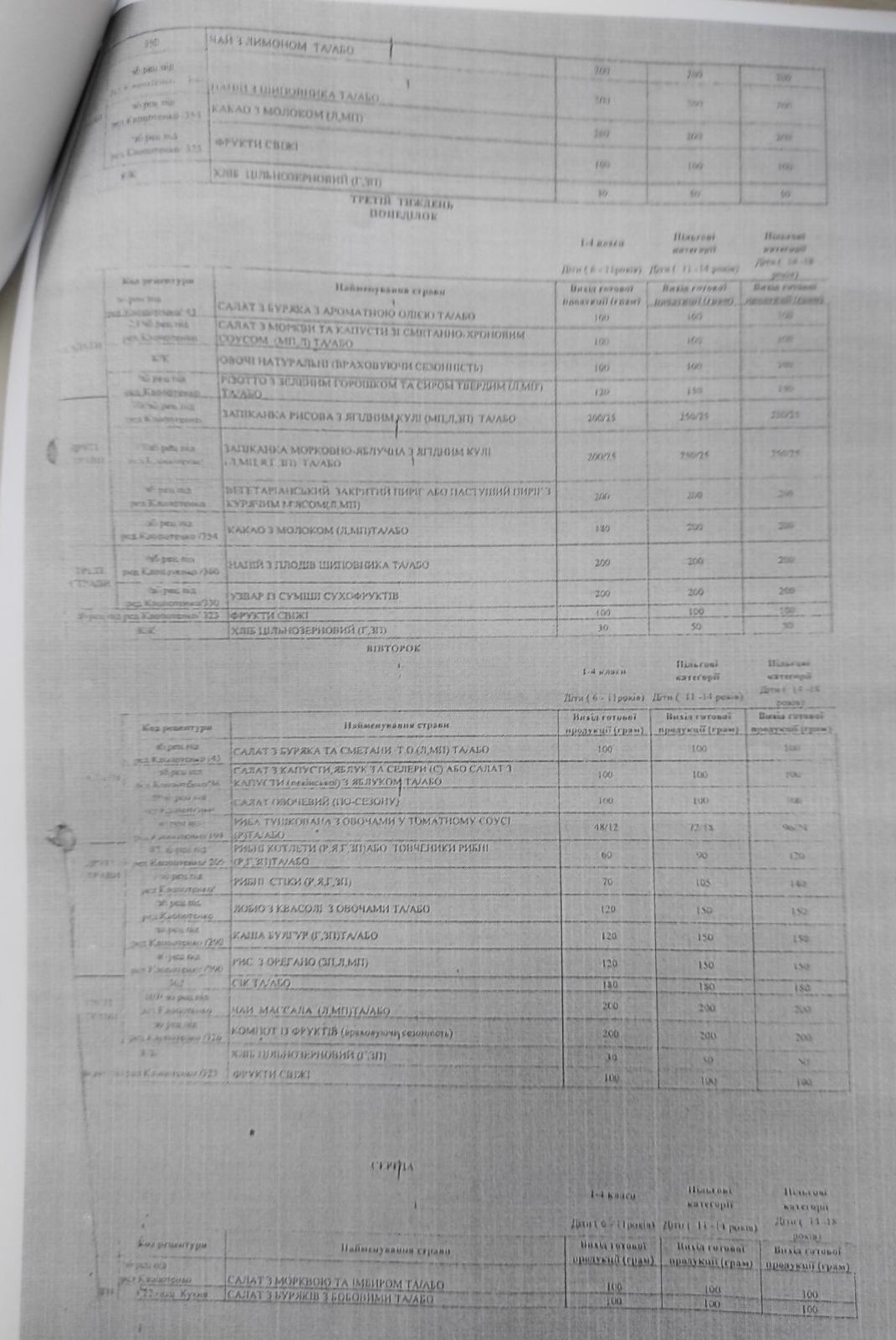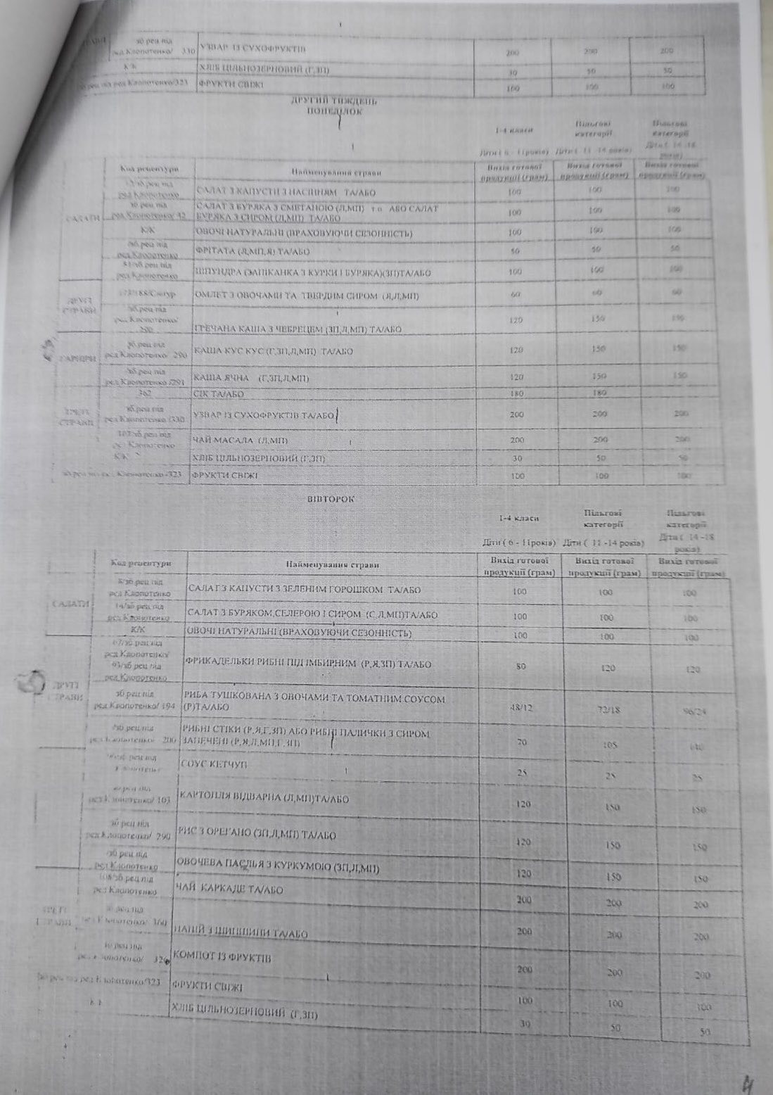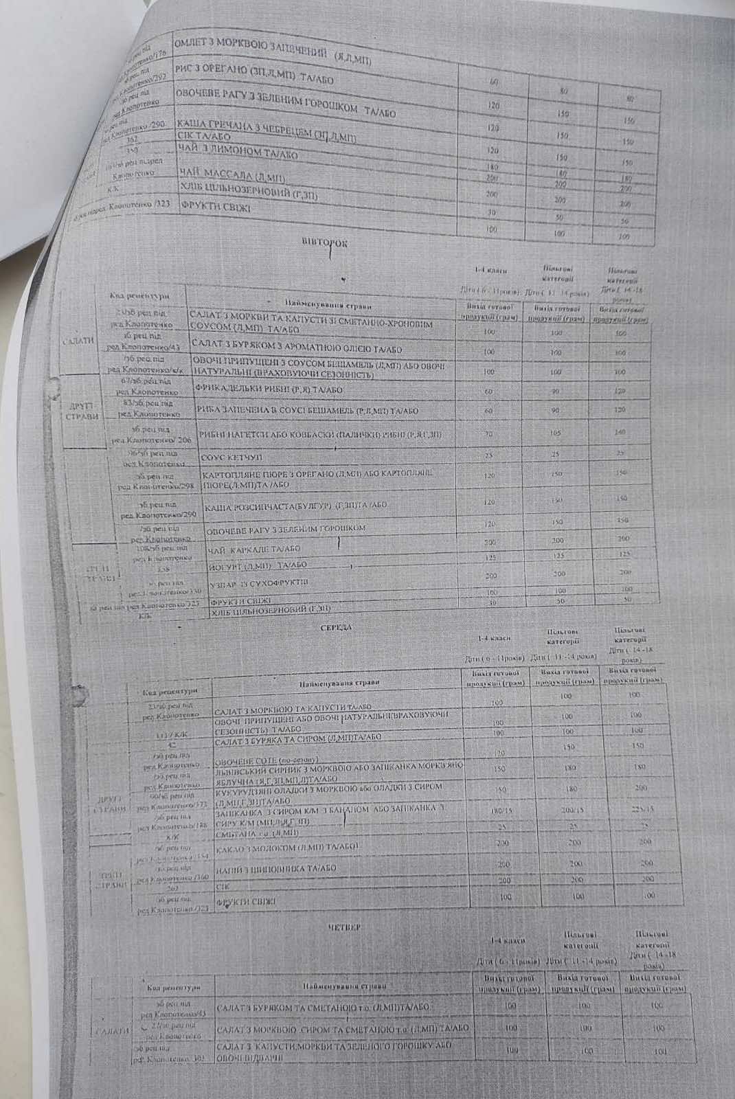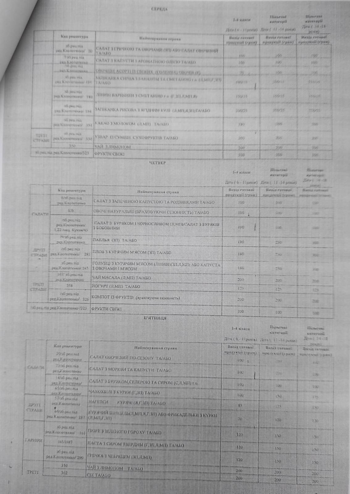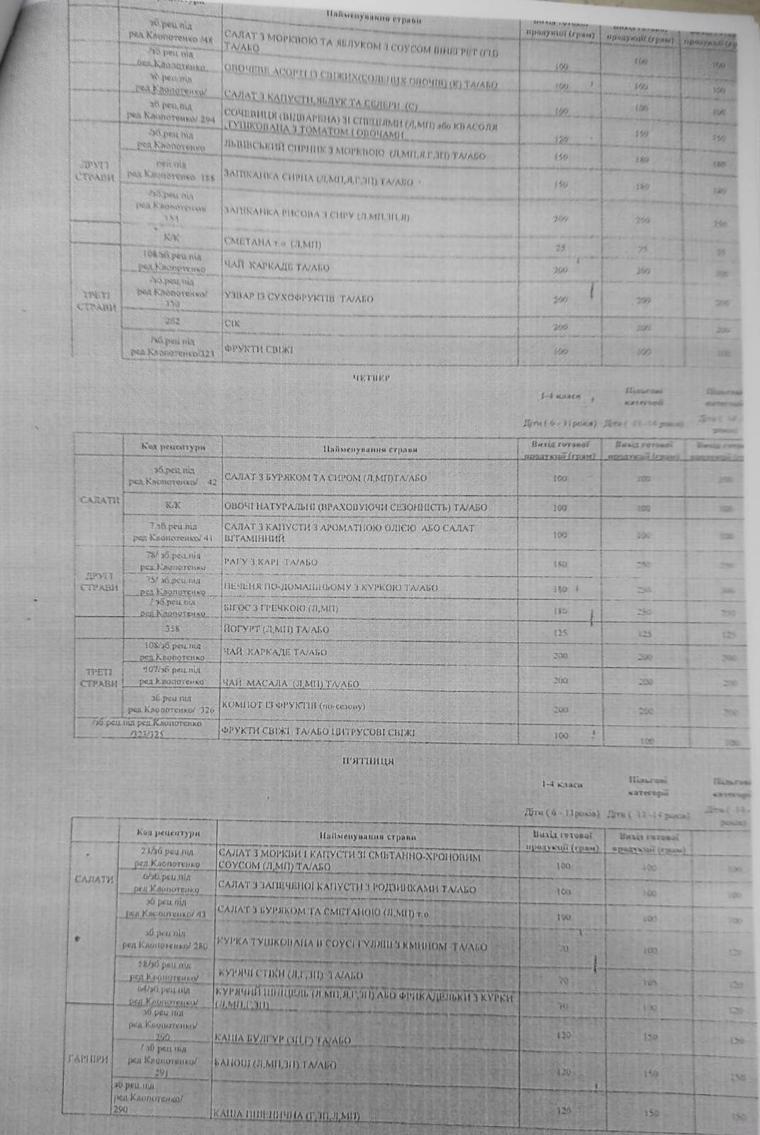 Також зменшені норми споживання хліба та картоплі, збільшена кількість споживання молока та кисломолочних продуктів, м’яса, риби, круп та бобових. Збільшені норми щодо рослинного та вершкового масла, розширена варіація використання продуктів під час складання меню.