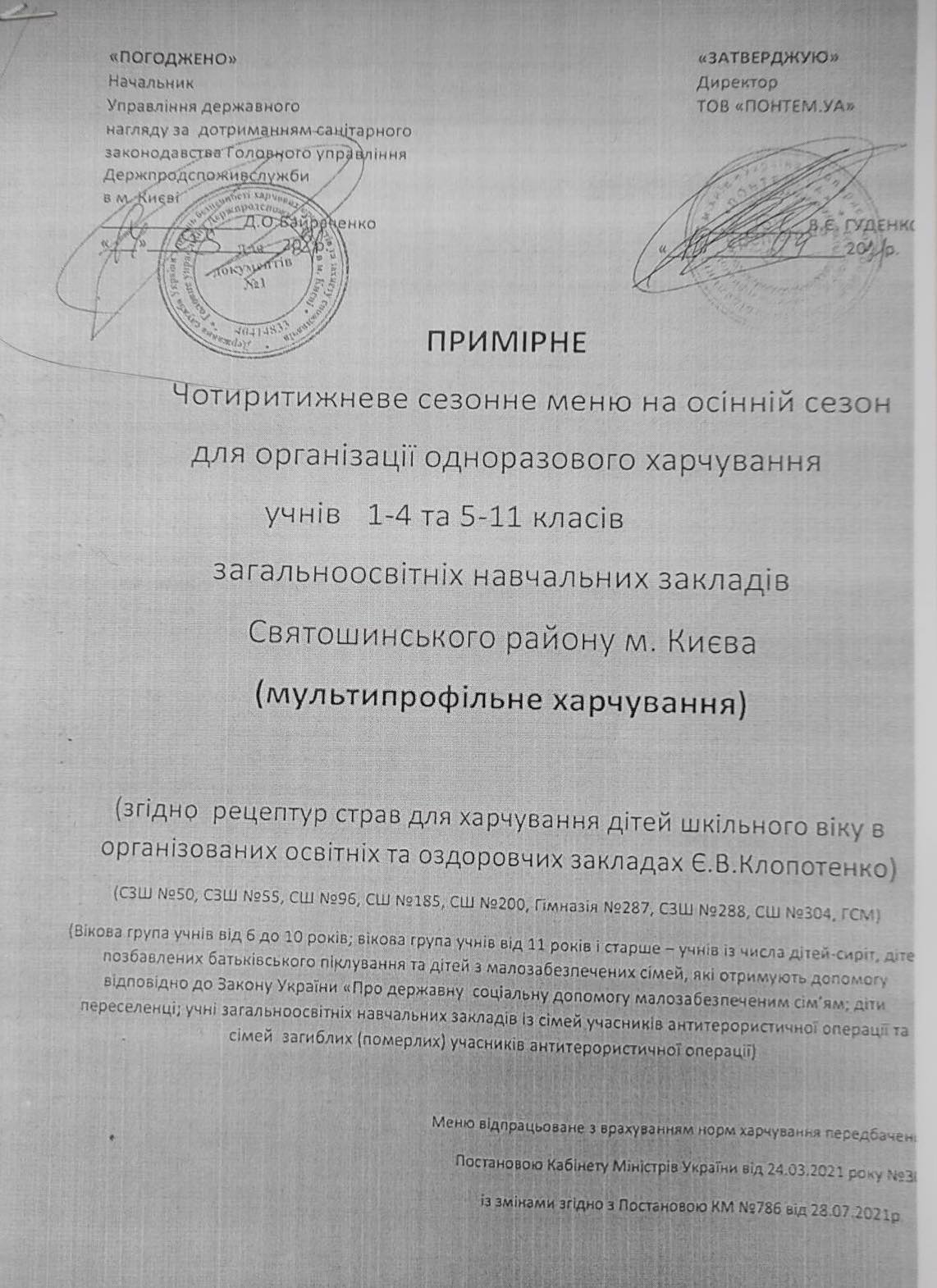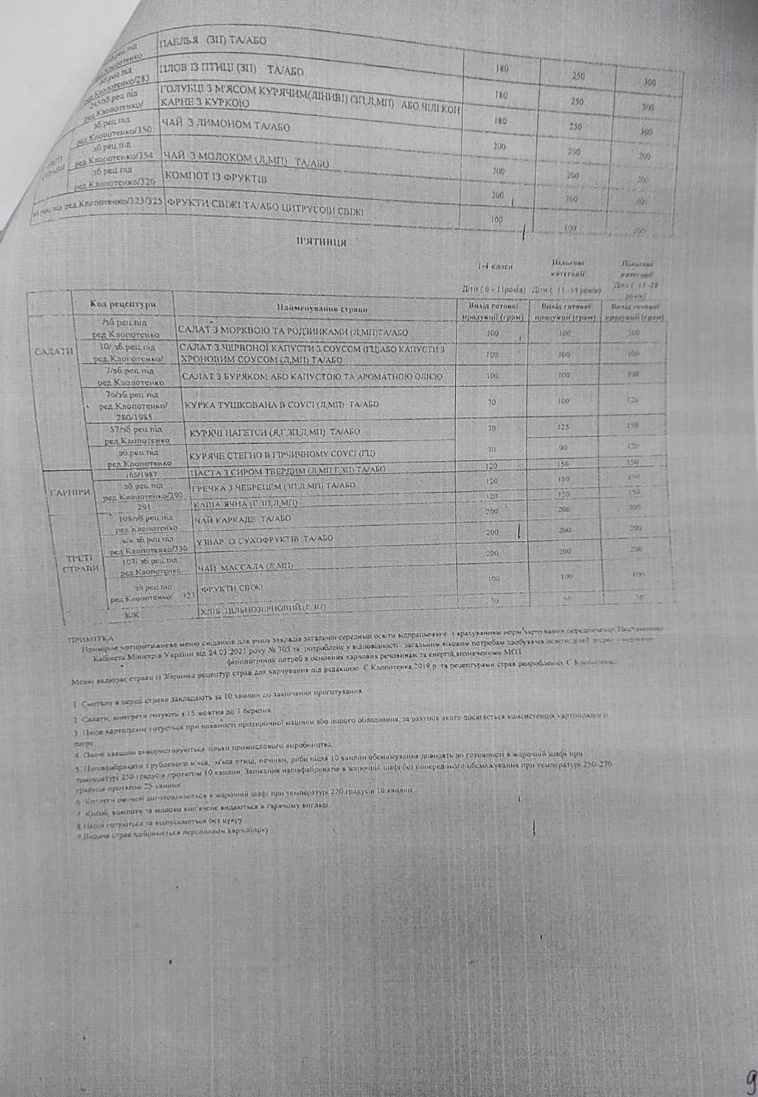 1 вересня 2021 року набули чинності норми харчування у закладах освіти та дитячих закладах оздоровлення та відпочинку та Порядок організації харчування у закладах освіти та дитячих закладах оздоровлення та відпочинку, затверджені постановою Кабміну № 305 від 24 березня 2021 року.