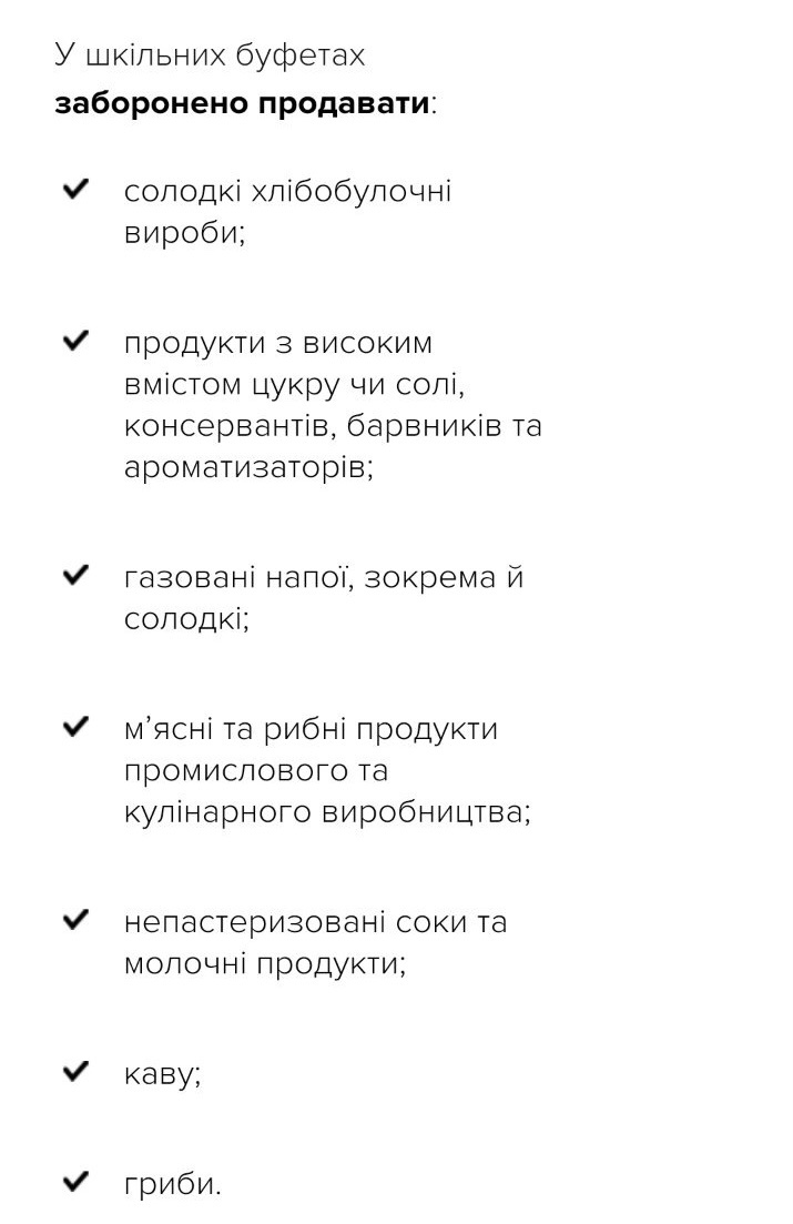 Серед іншого, новими нормами обмежена кількість солі та цукру, жирів рослинного і тваринного походження, а також соків. До нових норм не включено ковбасні вироби, сосиски, рибні, м’ясні та плодоовочеві консерви, кондитерські вироби, оскільки ці продукти мають високий вміст солі, цукру, а деякі з них — консерванти та трансжирні кислоти, що суперечить принципам здорового харчування.