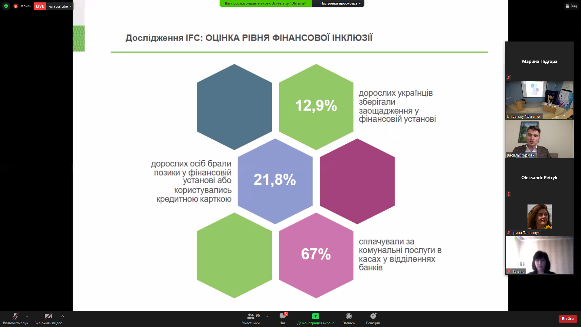 В онлайн-режимі до круглого столу Відкритого міжнародного університету розвитку людини «Україна» долучились директор школи Марина Анатоліївна та заступник директора з навчально-виховної роботи Лариса Володимирівна. Метою проведення заходу була ідентифікація проблем та ознайомлення зі світовим досвідом ефективних практик впровадження фінансової інклюзії в контексті співпраці держави — бізнесу — населення як інструменту досягнення фінансової незалежності держави.
