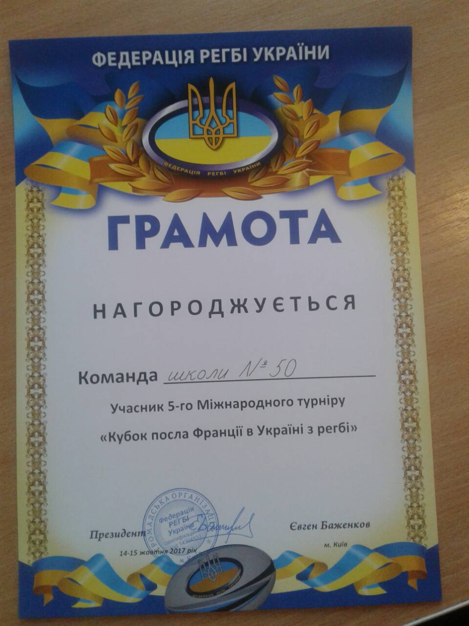 Нагородження — найприємніший момент! Учасників міського турніру з регбі за підтримки Посла Франції в Україні Ізабель Дюман нагородив президент асоціації ДЮШ «Регбі» Данилейко Л.А.