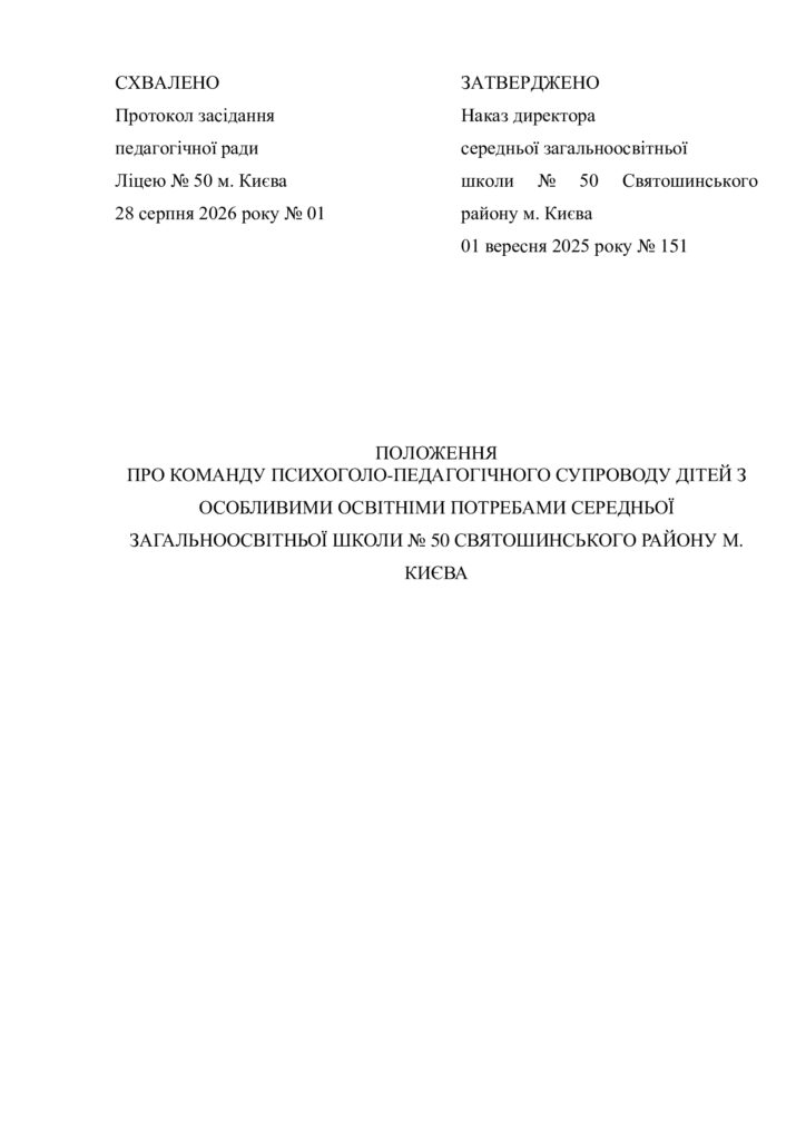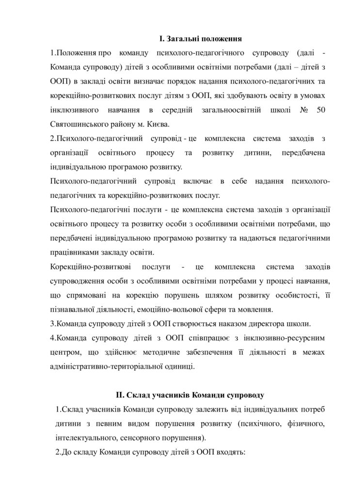 ПОЛОЖЕННЯ ПРО КОМАНДУ ПСИХОГОЛО-ПЕДАГОГІЧНОГО СУПРОВОДУ ДІТЕЙ З ООП СЗШ № 50 СВЯТОШИНСЬКОГО РАЙОНУ М. КИЄВА