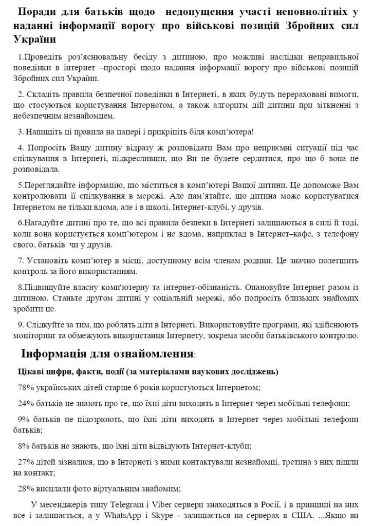 Поради для батьків щодо недопущення участі неповнолітніх у наданні інформації ворогу про військові позицій Збройних сил України