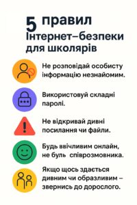 ✨ Сьогодні з 5 класом говорили про безпеку в Інтернеті. Разом з учнями пригадали 5 головних правил: як створювати надійні паролі, не відкривати підозрілі посилання, бути ввічливими онлайн та завжди звертатися до дорослих у разі небезпеки. 💻🔒