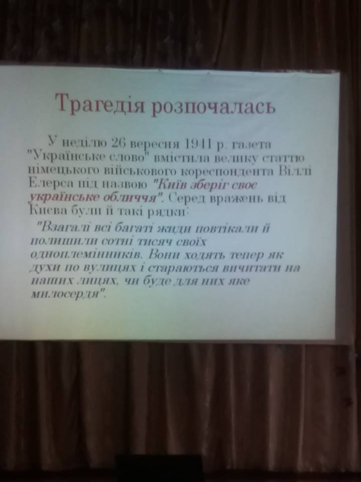 Гортаємо сторінки нашої історії… часами болючі та пронизливо промовляючі до сьогоднішнього та майбутнього, до кожного з нас. Маємо пам’ятати заради того, щоб навчитися любити та цінувати життя, кожну людину. 75-та роковина подій у Бабиному Яру — саме той момент, коли схиляємо голови перед загиблими…