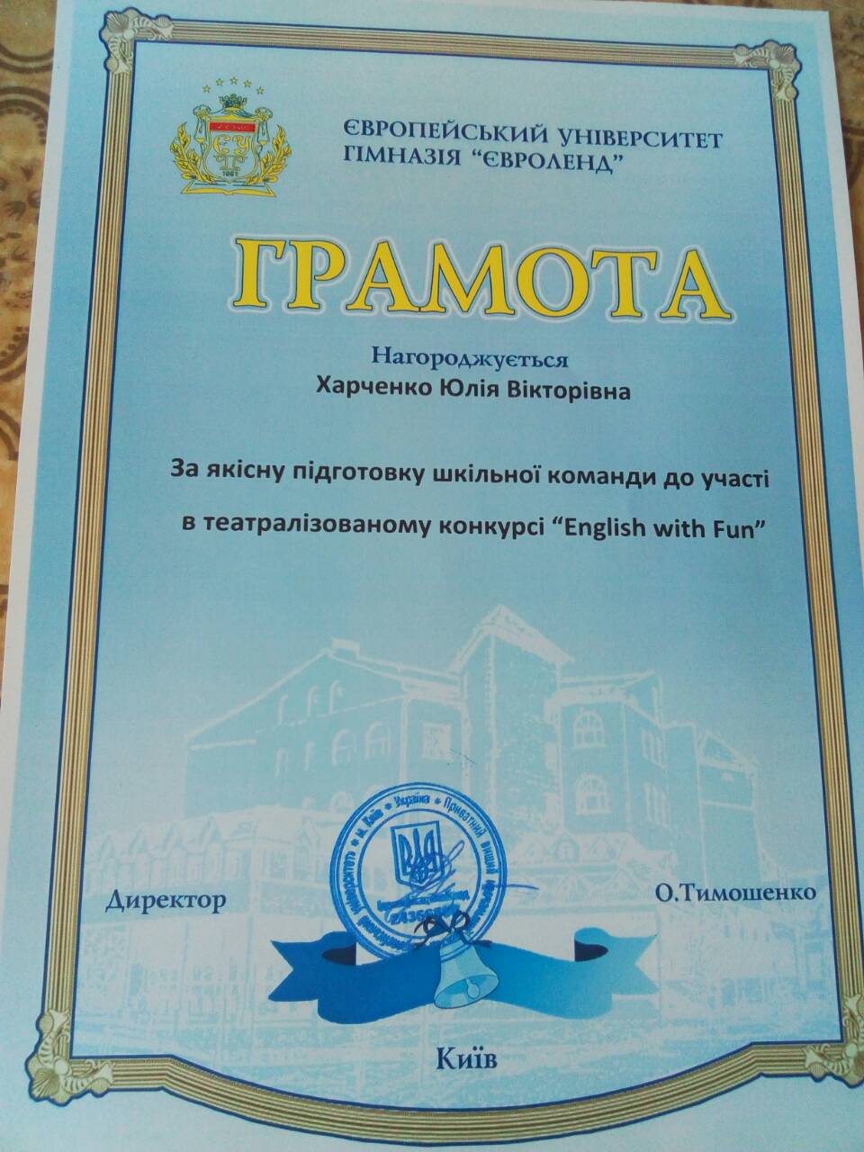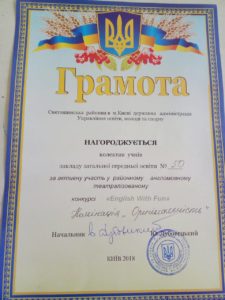 Театральні дійства, феєрія, музика, танцювальні композиції, філософські задуми…Таким насиченим і пронизливим був виступ команди школи № 50 під керівництвом учителя англійської мови Харченко Юлії Вікторівни на англомовному фестивалі “English with fun”. За достойне представлення велика подяка учням 7-б класу (Журавльовій К., Красоті Р. ), 6-б класу (Горай А., Сербіній Д.), 5-б класу (Павловій В., Хабібуліній Р., Борисовій Л., Голяк К.)