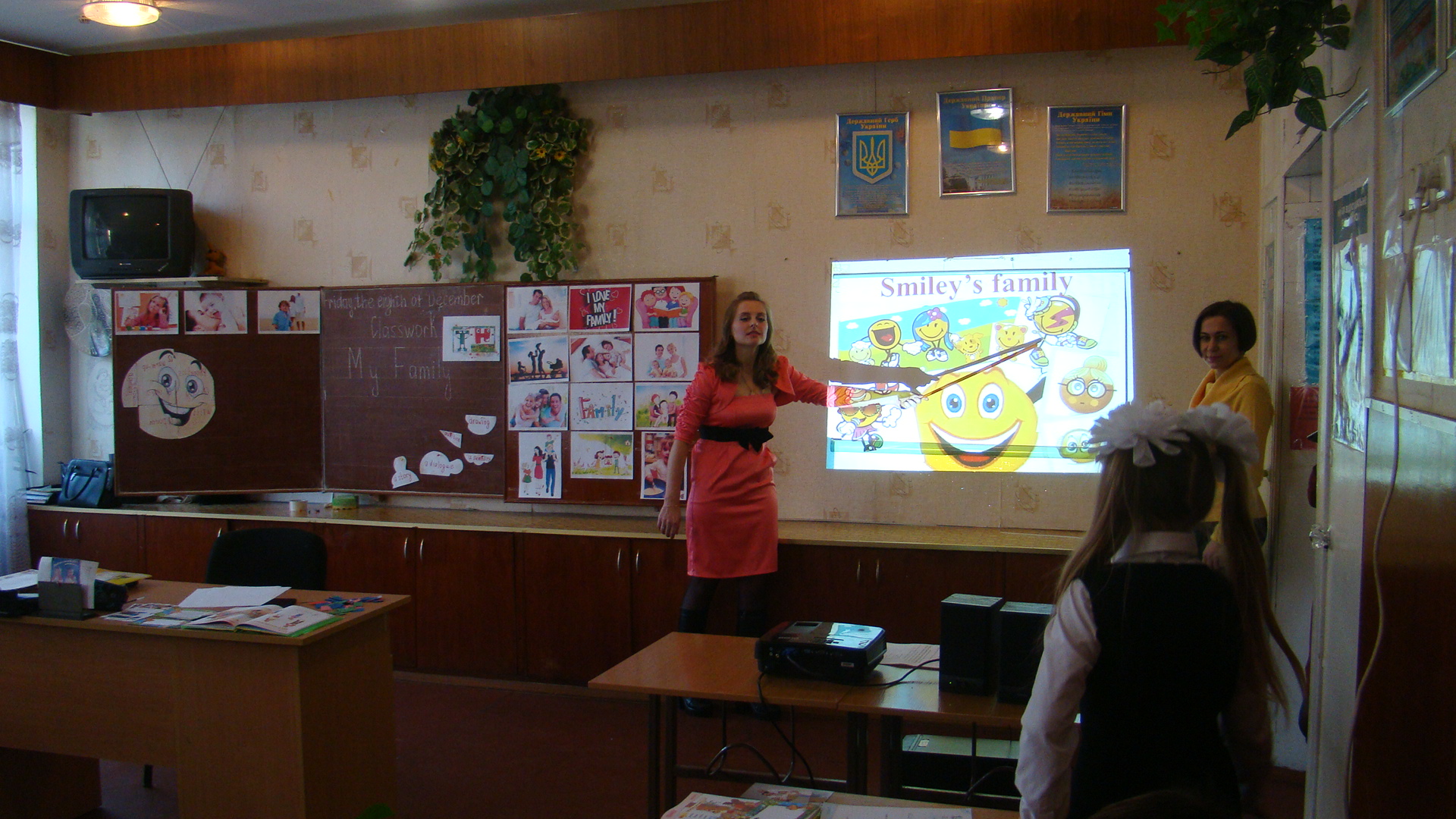 З цією метою 8 грудня відбувся відкритий урок англійської мови у 1-А класі школи № 50 на тему «My family» з використанням інноваційно-комунікаційних технологій для молодих спеціалістів. Учитель Харченко Юлія Вікторівна застосовувала різноманітні методи та прийоми на уроці, залучивши до роботи всіх учнів. Кожен етап уроку був частинкою великого пазла і діти з нетерпінням чекали на наступне завдання. Під час заняття вони і гралися, і співали, і працювали парами, дивилися відеоролики, декламували вірші, розповідали про свою сім’ю, отримуючи фішки з похвалою. Приємною несподіванкою для учнів була поява Смайлика, Міс Вимови, Містера Здоров’я.