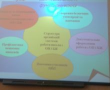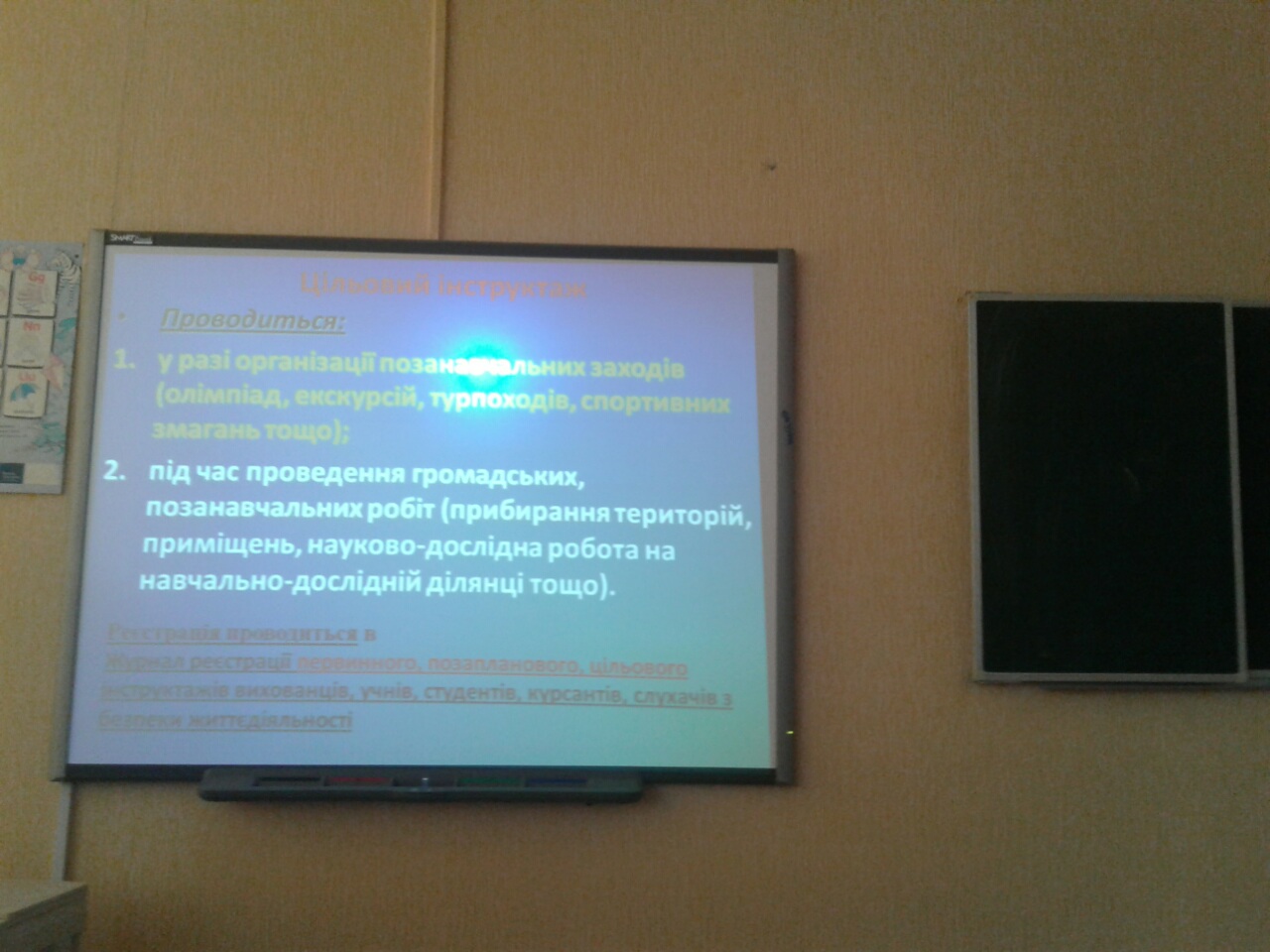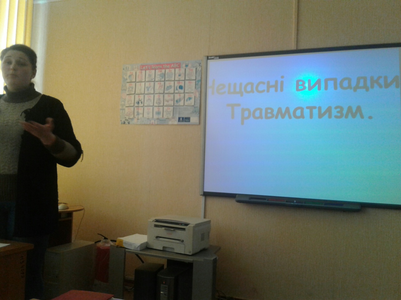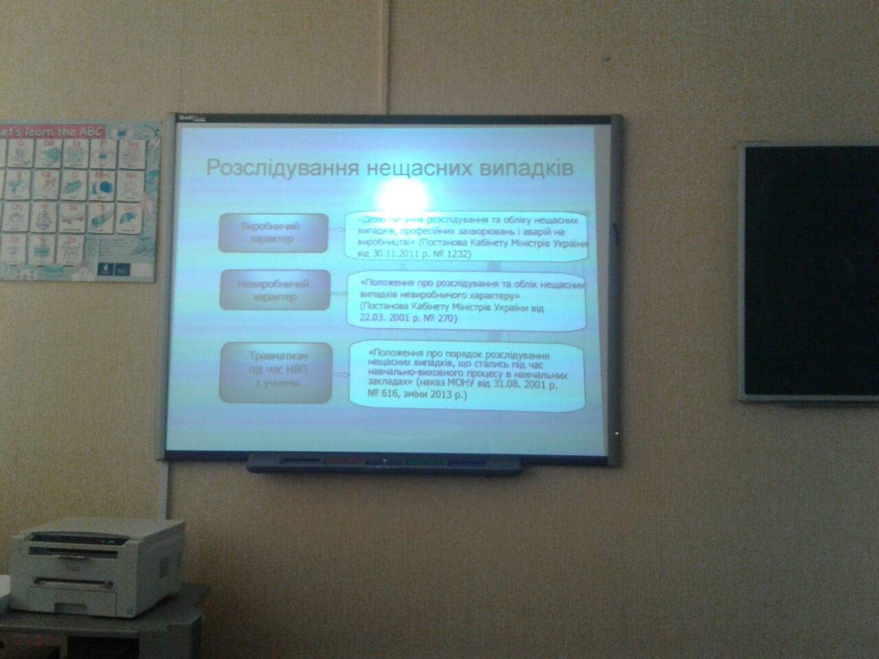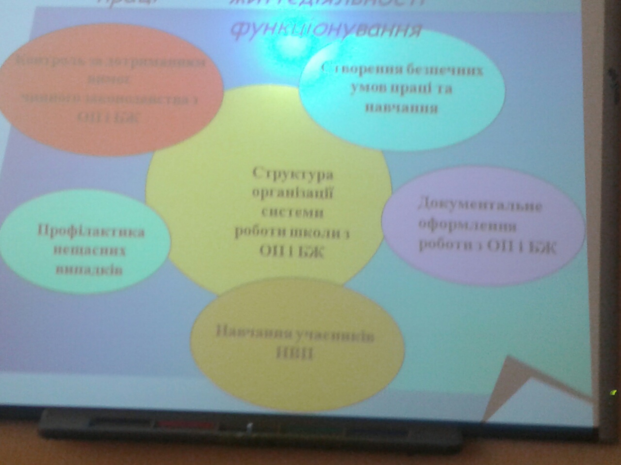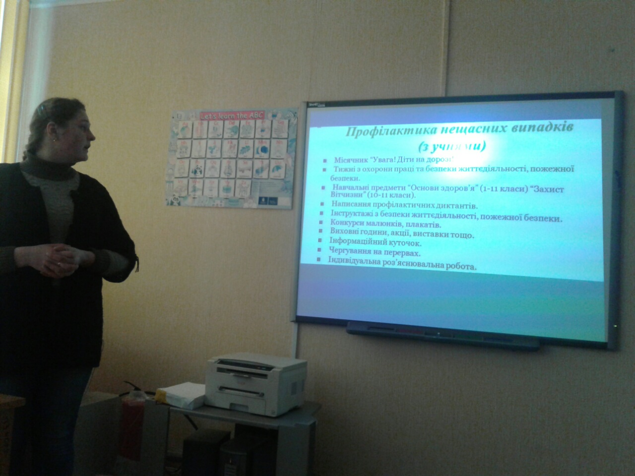 Заступник директора Литвин Ніна Петрівна розповіла, що головною метою школи є створення для кожного учня та працівника безпечних умов праці та безпечної експлуатації обладнання, зменшення або повна нейтралізація дії шкідливих факторів на організм людини і як наслідок — зниження травматизму. Ознайомилися працівники з структурою організації системи роботи школи з охорони праці та безпеки життєдіяльності, кабінетами підвищеної небезпеки у навчальному закладі, поясненням кожного із видів інструктажів, які проводяться не лише із учнями, а й із працівниками та видами травматизму, а також порядком їх розслідування та попередження.