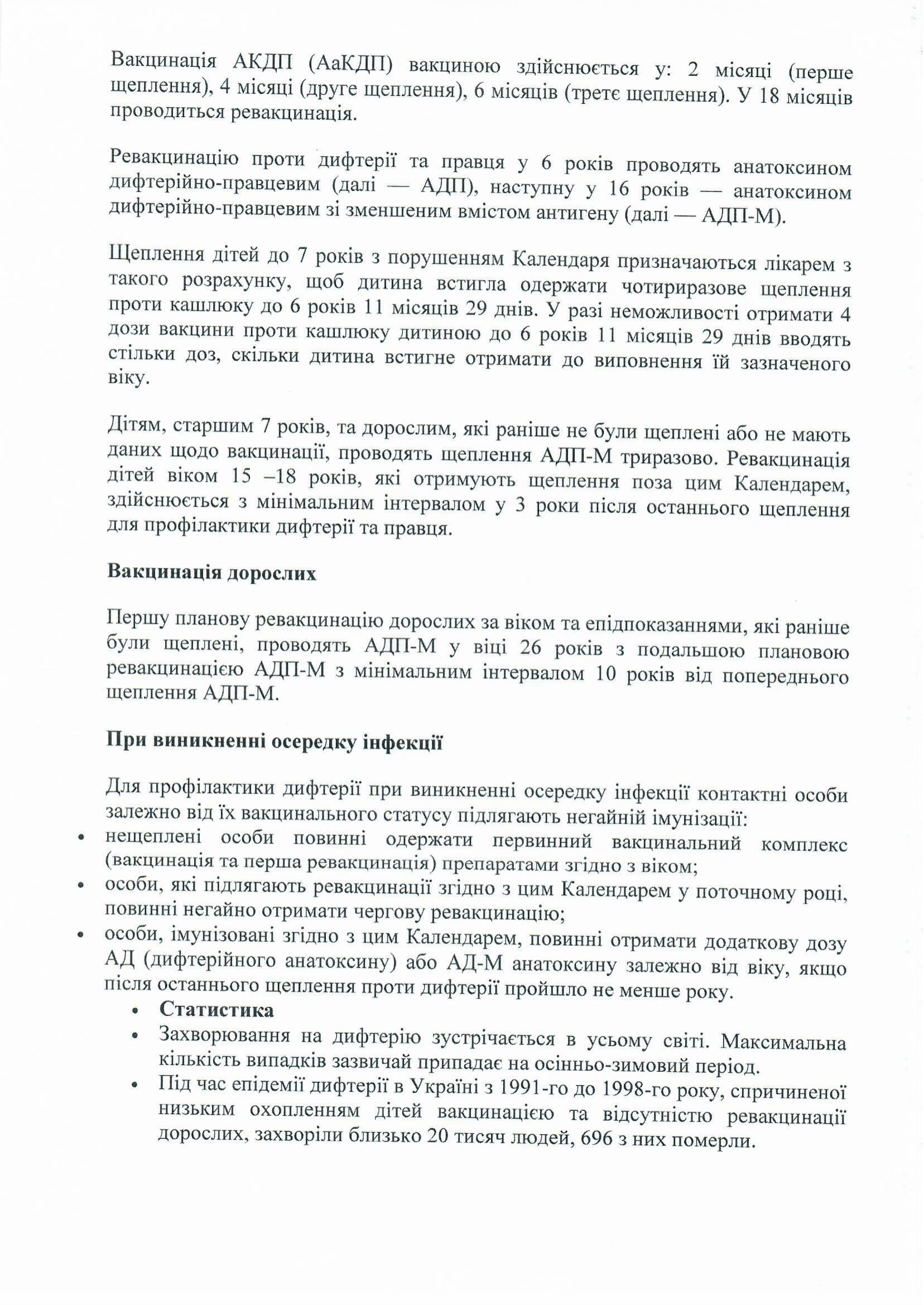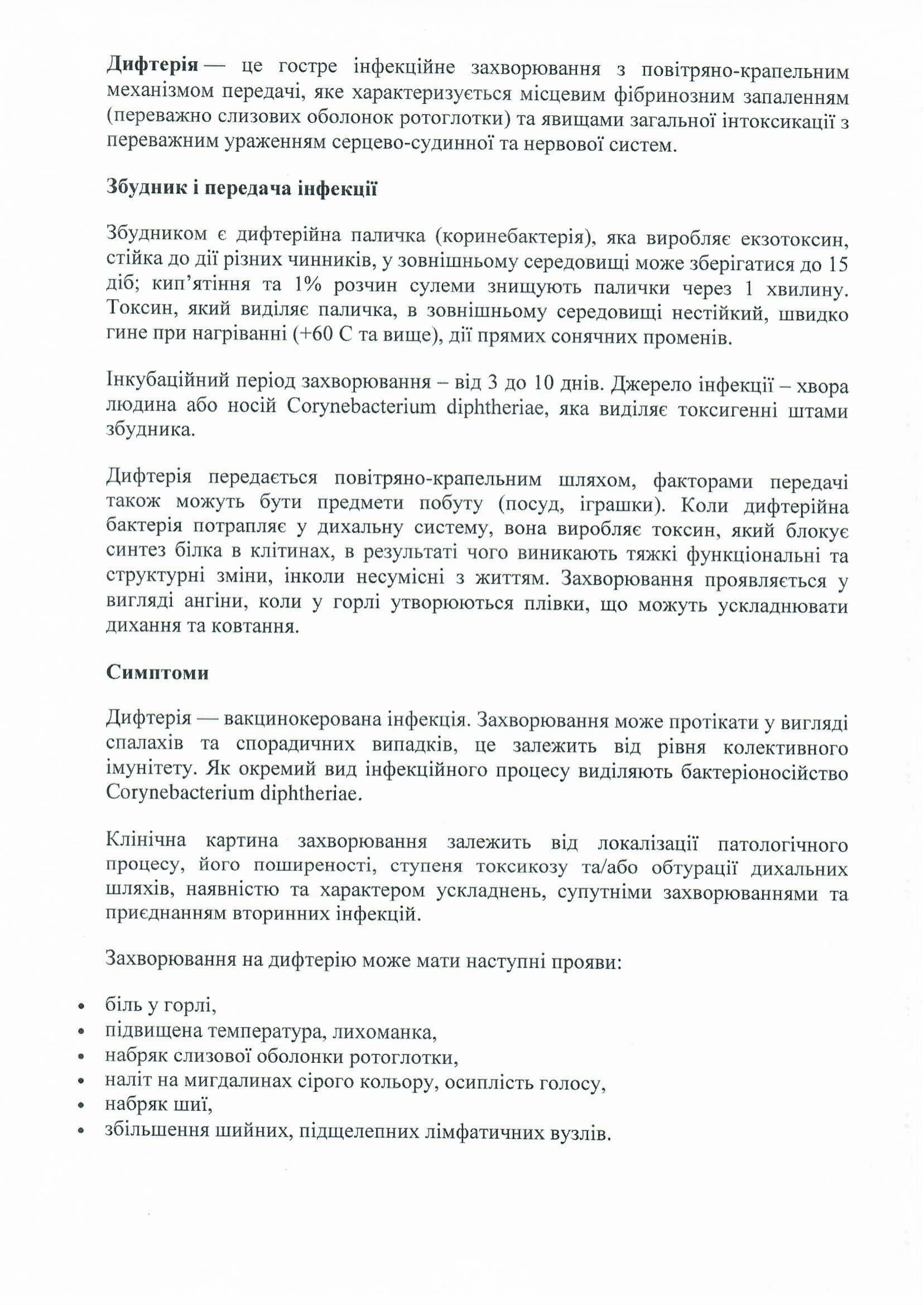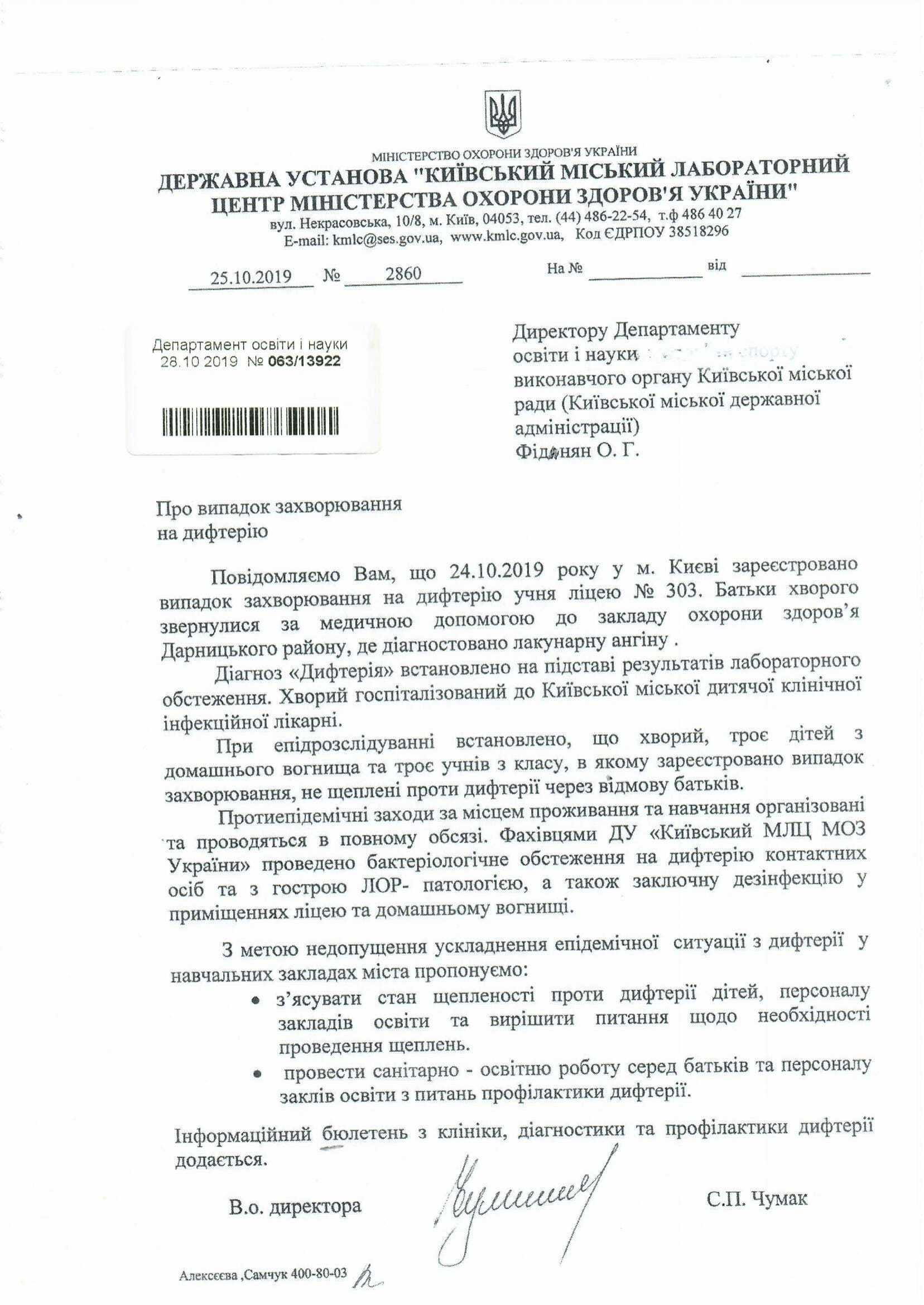 Повідомляємо, що за інформацією Державної установи «Київський міський лабораторний центр Міністерства охорони здоров’я України» 24.10.2019 р., зареєстровано випадок захворювання на дифтерію учня одного із освітніх закладів Києва.