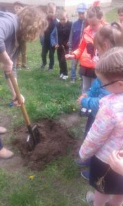 Усе оживає, квітне, буяє, милує око!.. Все довкола тягнеться до сонечка — прагне жити і рости. Навіть непомітна гілочка пускає коріння і проситься до землі… Учні першого класу також ростуть і вирішили допомогти молодим пагонам прийнятись до своєї стихії)