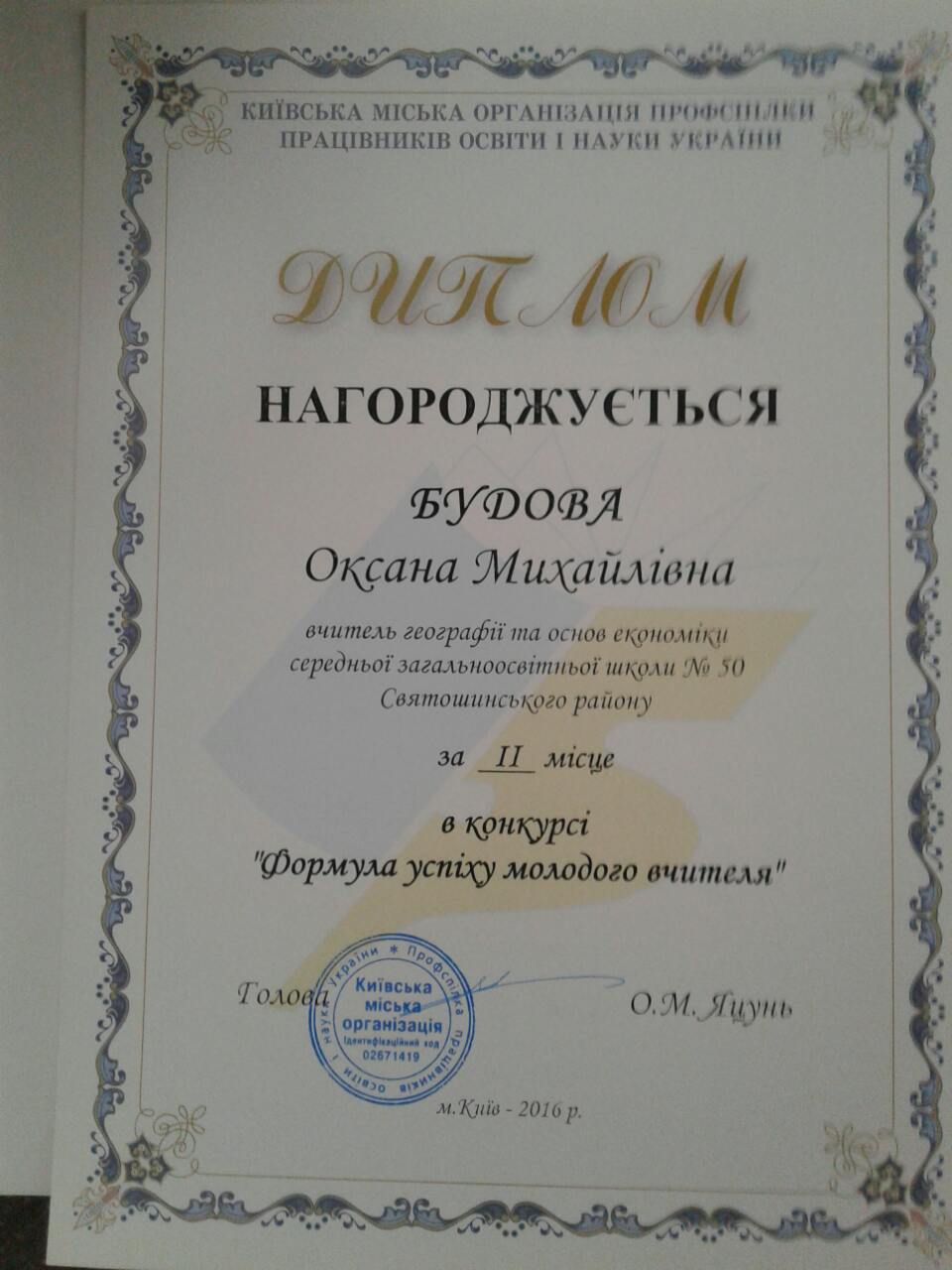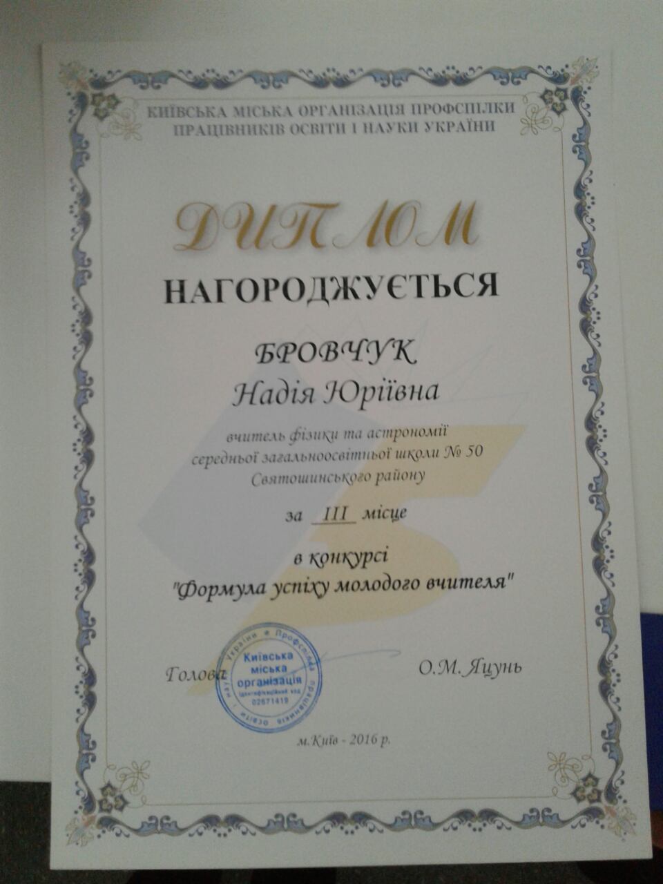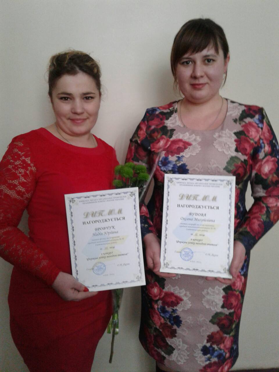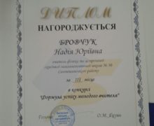 Формула успіху молодого вчителя… Якою вона є, як її вивести, як зрозуміти? Можливо, віднайти відповідь можна в кропіткій щоденній праці, в безмежній любові до дітей, в бажанні творити, вдосконалюватися, дарувати радість оточуючим… Такою цікавою, спонукаючою до роздумів була тема конкурсу, що проходив за ініціативи Київської міської організації Профспілки працівників освіти і науки України. Учителі школи № 50 Оксана Михайлівна Будова та Надія Юріївна Бровчук взяли участь у цьому творчому конкурсі, поділившись власними роздумами, переживаннями, планами та посіли почесні ІІ та ІІІ місця. 07 лютого їх та інших учасників крнкурсу привітали Яцунь Олександр Михайлович, Голова Київської міської організації Профспілки працівників освіти і науки України та Заворітько Людмила Олексіївна, голова профспілки районного управління освіти, молоді та спорту Святошинської районної в місті Києві державної адміністрації.