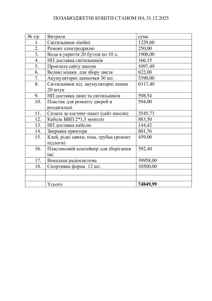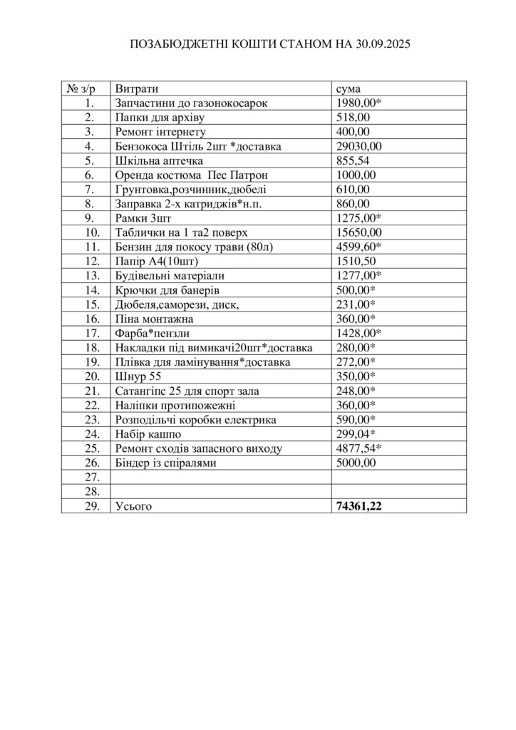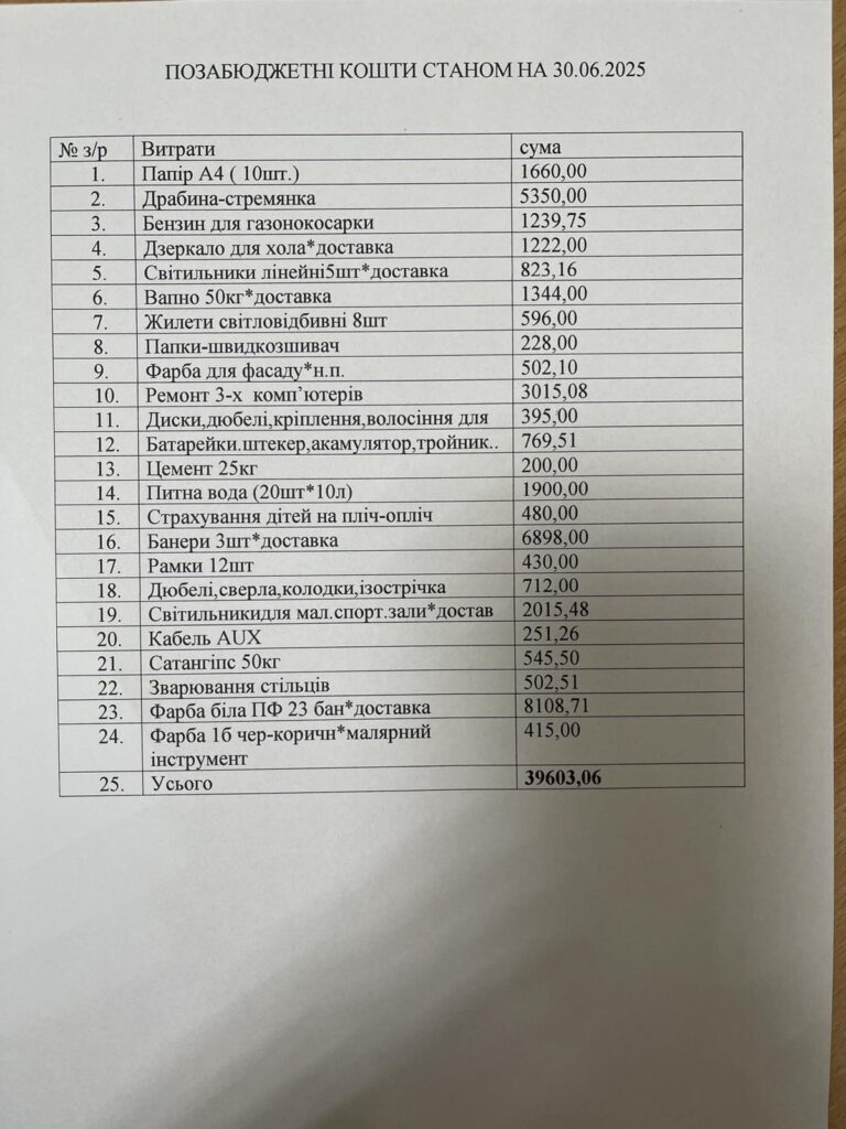 | 29 | Ремонт кабінетів (шпалери, витратні матеріали, водоемульсійна фарба, штукатурка, робота) | 8840,00 |
